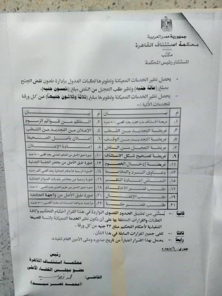 فمثلًا ارتفعت تكلفة تصوير الورقة الواحدة من جنيه واحد إلى أكثر من خمسة جنيهات، بينما قفزت رسوم استخراج شهادة بعدم حصول استئناف من 25 إلى 60.5 جنيهًا، وشهدت بعض الرسوم الأخرى زيادات غير مسبوقة تراوحت بين 300% و900%، فضلًا عن أخرى زادت بنسبة 500%، مثل رسوم رفع الدعوى، ورسوم الحوافظ، وأتعاب المحاماة.