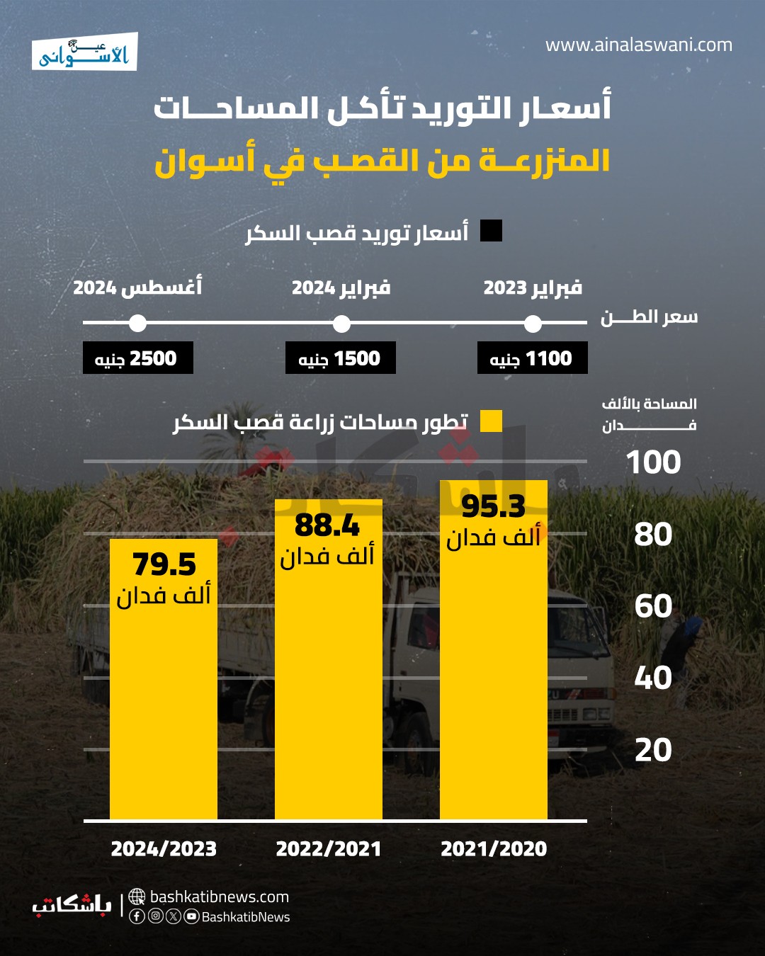 تظهر بيانات محافظة أسوان والجهاز المركزي للتعبئة والإحصاء تراجع مساحات زراعة قصب السكر من 95 ألف فدان خلال العام 2021 إلى 88 ألف فدان العام 2023 ثم 79 ألف فدان العام 2024، مما يعكس وجود تحديات كبيرة تواجه قطاع زراعة قصب السكر.