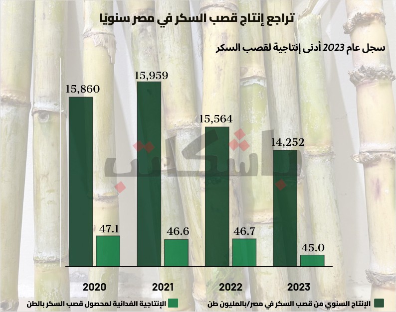 يعكس الواقع أثر تناقص مساحات زراعة قصب السكر في مصر، حيث تُظهر بيانات نشرة الإحصاءات الزراعية الصادرة عن وزارة الزراعة تراجعًا في إنتاجية مصر من قصب السكر، إذ بلغ إجمالي الإنتاج في عام 2023 نحو 14.25 مليون طن، مقارنة بـ15.56 مليون طن في عام 2022.