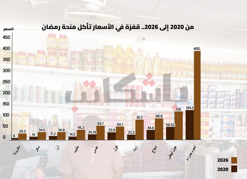 فبعد أن كان تكلفة شراء هذه المجموعة من السلع بموجب كيلو من كل سلعة أساسية (سكر، زيت، أرز، لحوم، وغيرها) تبلغ نحو 373.3 جنيه في رمضان 2020، قفزت لتصل إلى 1163.4 جنيه في عام 2026، بينما تضاعفت قيمة المنحة ثلاث مرات فقط.