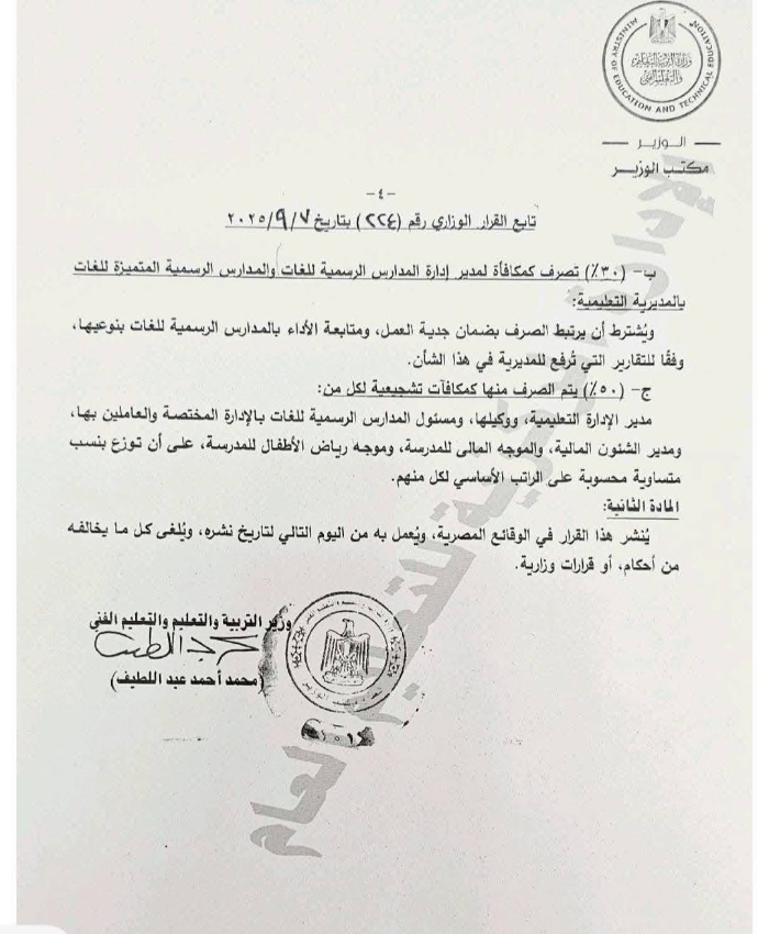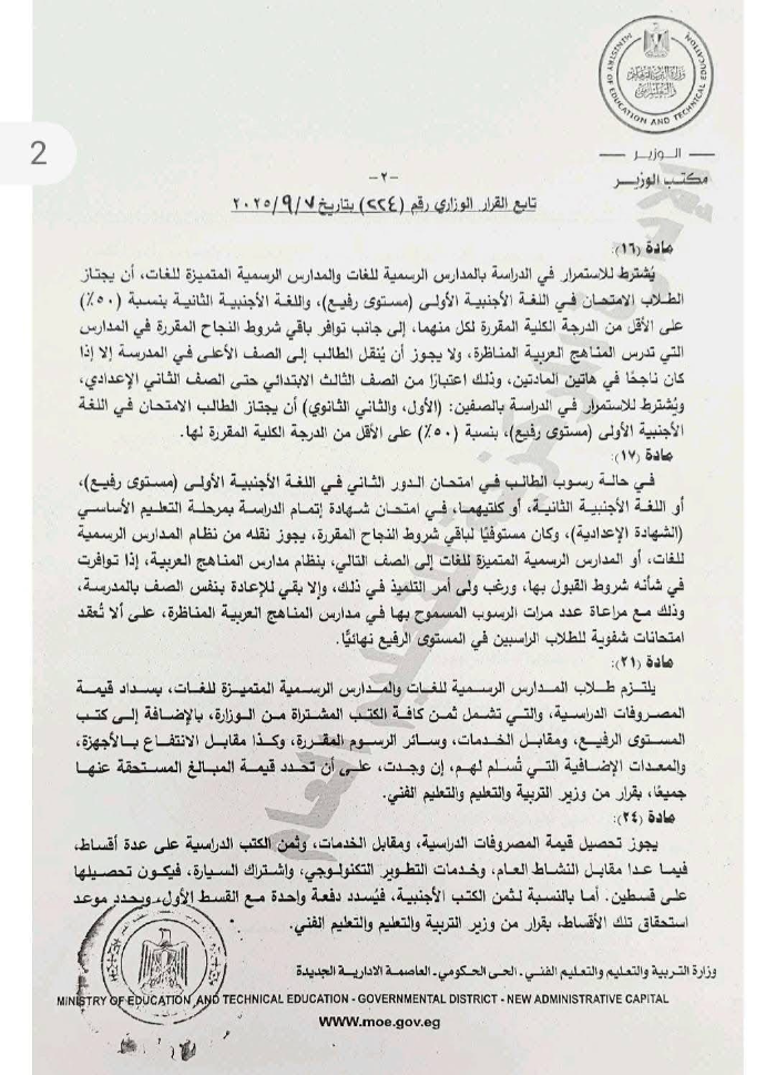 وجاء في نص القرار الوزاري رقم 224 لسنة 2025، الصادر في 7 سبتمبر 2025، أن وزارة التربية والتعليم قررت ضم رسوم الكتب المدرسية إلى المصروفات الدراسية في المدارس التجريبية للغات، ونص القرار كذلك على أن: "في جميع الأحوال يتم تحصيل كافة مبالغ المصروفات، ومقابل الخدمات وثمن الكتب ومقابل الانتفاع، وكافة ما يستحق من مبالغ مالية بجهات وسائل الدفع غير النقدي، وفقًا لأحكام قانون تنظيم استخدام وسائل الدفع غير النقدي، دون غيرها، ويحظر سداد أي مدفوعات نقدية بأي وسيلة".