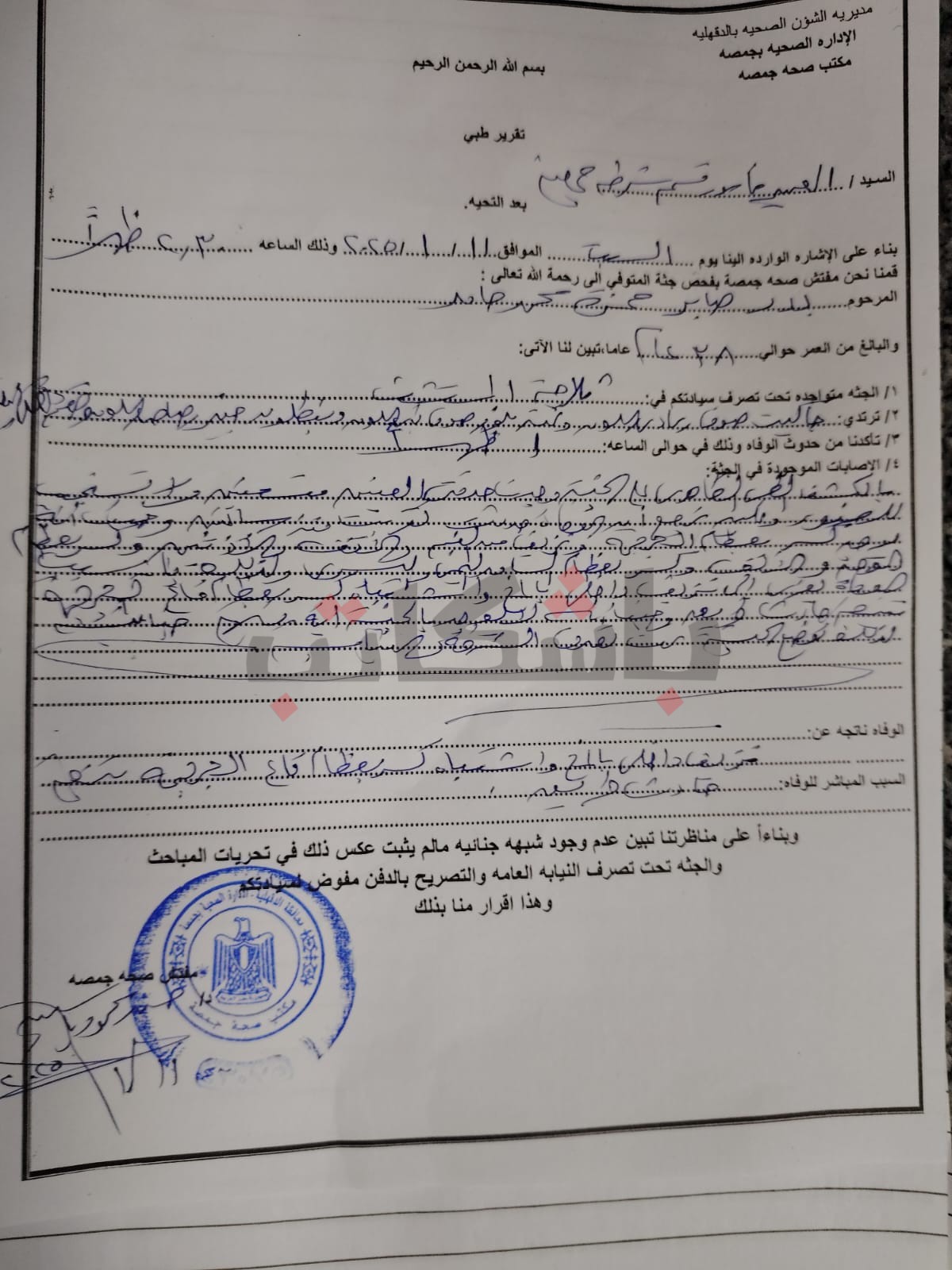 نقل صابر إلى مستشفى جمصة ولكن توفي في الحال، نتيجة كسور متفرقة في الجسم، ونزيف داخلي في المخ نتيجة الاصطدام، وفق تقرير مكتب صحة جمصة الذي حصل "قلم المنصورة" على نسخة منه.