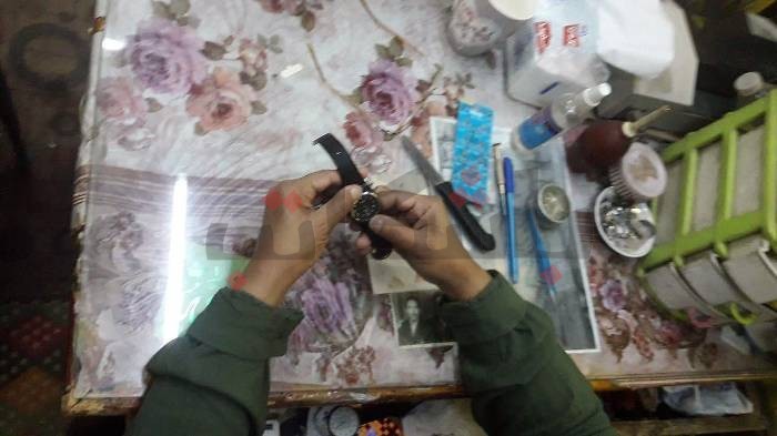 .يد طلب أحد زبائنها تصليحها، وفي أقل من ثالث دقائق، تعيدها وهي تعمل من جديد لصاحبها، بعد فك وتركيب الساعة لمعرفة سبب العطل