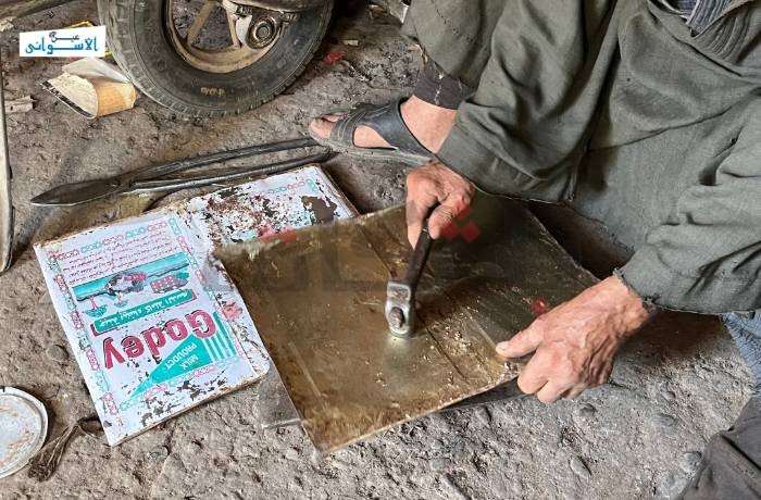 يبدأ عطا الله في مدخل بيته، بإعداد الصفيحة لتحويلها إلى صاجات كعك، باستخدام عصا معدني وشاكوش، يزيل الغطاء العلوي والسفلي للصفيحة وتهذيب الجوانب الحادة مكان القطع.