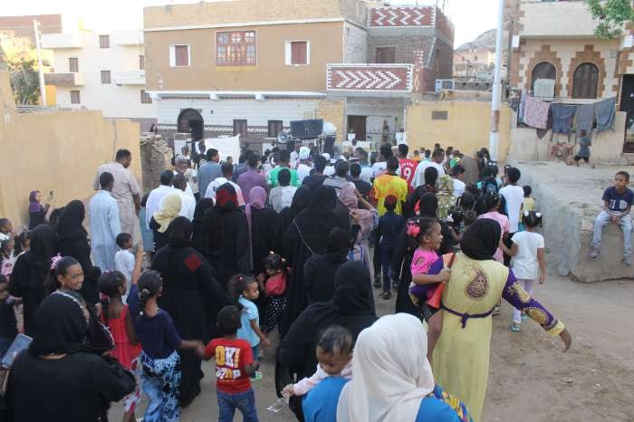ثم أتت النساء وأطلقن الزغاريد التي ملأت جنبات الطريق، كما تخلل الطواف إلقاء مجموعة من الحلوى والبسكويت والشوكولاتة والعصائر، وتوزيع أطباق "الأرز بلبن".