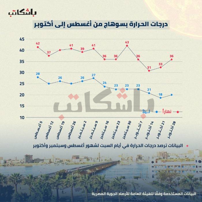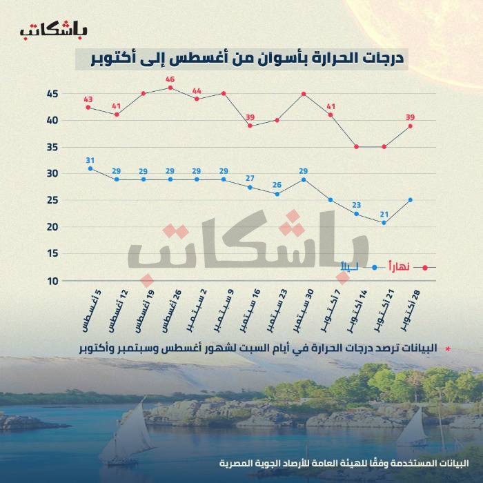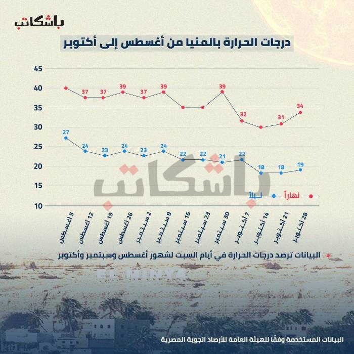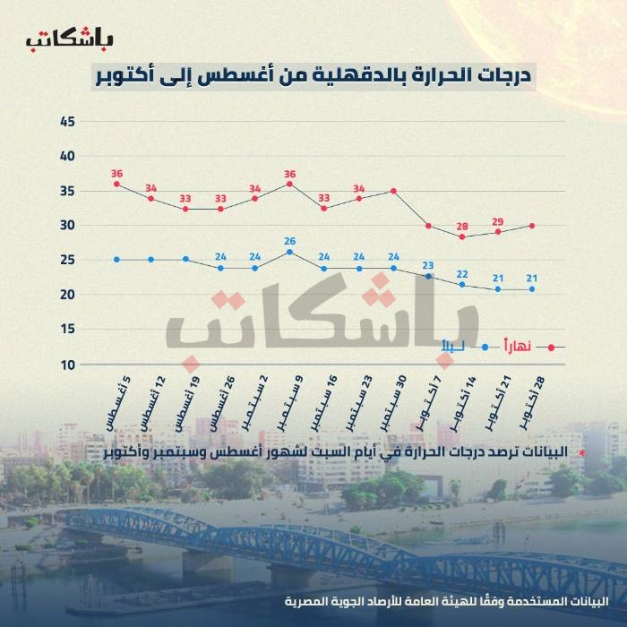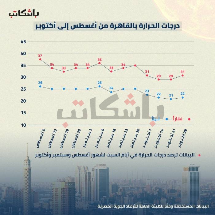 فى الانفو التالي، وفقًا لتحليل درجات الطقس العليا والصغرى التي ترصدها يوميًا الهيئة العامة للأرصاد الجوية فى مصر على سبيل المثال، نجد أن هناك انخفاض درجات الحرارة بالفعل خلال شهر أكتوبر مقارنة بالشهور السابقة، وليس كما يصرّح المسؤولون بتحميل ارتفاع درجات الحرارة أزمة انقطاع الكهرباء المستمرة والمتزايدة.