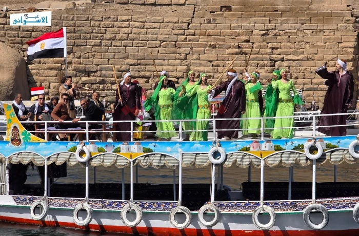 ارتفعت أصوات الطبول والإيقاعات التقليدية على ضفاف النيل، متماهية مع هدير الأمواج ولون السماء الصافي، لتشكل سيمفونية بصرية وسمعية تجمع بين سحر الطبيعة وروعة التراث الشعبي.