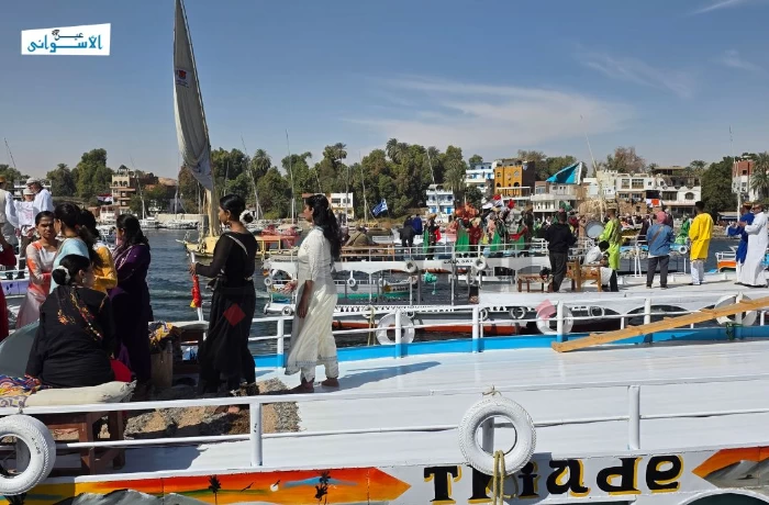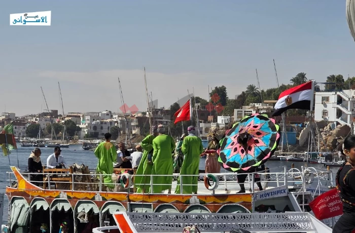 على وقع الطبول ووسط أشعة الشمس على مياه النيل، انطلق "الديفيليه النهري" بالمراكب، صباح اليوم الأربعاء، في مهرجان أسوان الدولي للثقافة والفنون بأجواء ملؤها البهجة والحيوية.