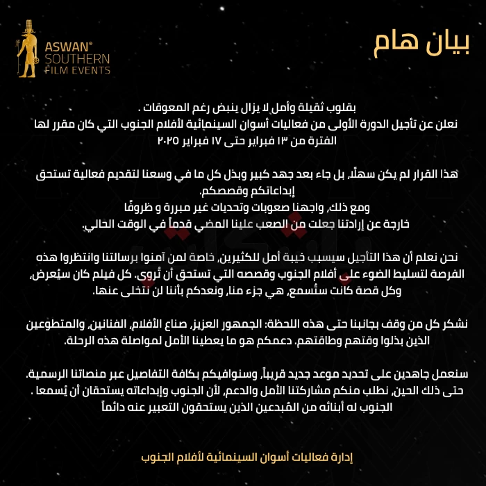 وأكدت الإدارة في بيانها أن التأجيل كان خارجًا عن إرادتها، واصفة القرار بـ"ليس سهل"، وأضافت "خاصة بالنسبة للكثيرين الذين آمنوا برسالة المهرجان، ورأوا فيه فرصة لتسليط الضوء على أفلام الجنوب وقصصه التي تستحق أن تُروى".