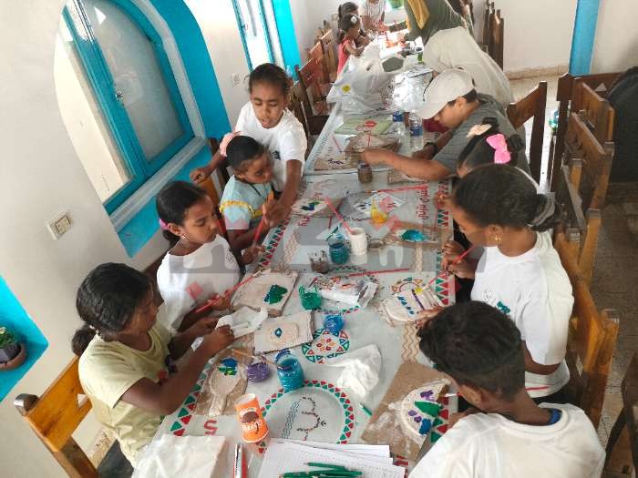 كما شارك وليد محمد -8 سنوات- بالرسم على ورق رسمة لفندق اشري نارتي ومركب وبحر، وكذلك حنين أحمد عبد المجيد، التي أعجبت بالفعاليات والأنشطة.