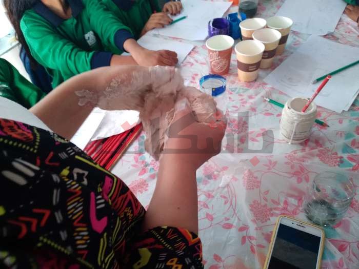 تكمل مدربة المسرح الأسود وورشة طباعة أميرة سعد: "شاركت مع الأطفال بنوع من أنواع الطباعة البارزة، نحضر الاستيكة الخاصة بالطفل وبعد ذلك يحفر عليها الشكل والاسم وتطبع على ورق أو قماش".