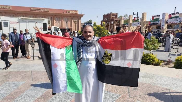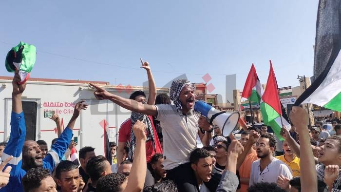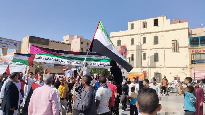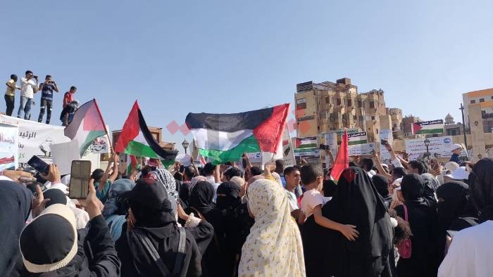 وتحركت الوقفة وتحولت لمسيرة في محيط الساحة، فيما اصطحب الأهالي أطفالهم للمشاركة والهتاف، حاملين أعلام مصر وفلسطين.