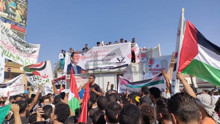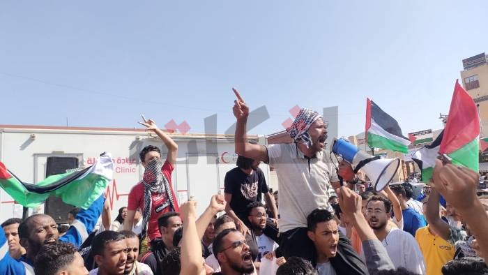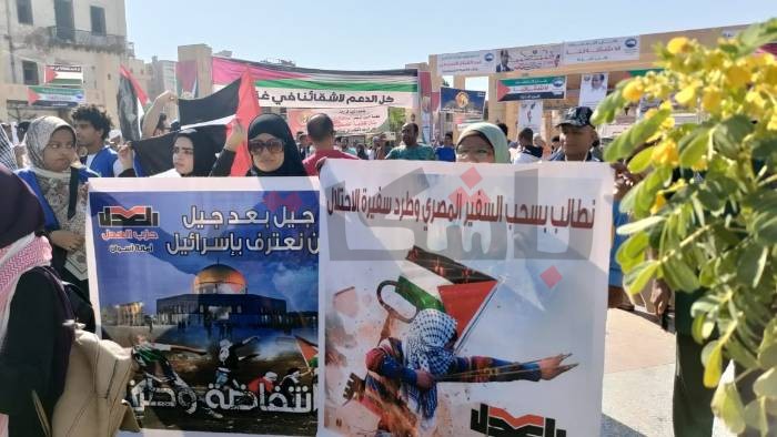 وامتلأت ساحة ميدان المحطة باللافتات الداعمة لفلسطين، وعلا صوت الشباب بهتاف: “يسقط قتلة الأطفال.. قولوا ورانا يا مصريين مش هنسيبك يا فلسطين.. اسمعونا يا يهود القضية مش حدود”.