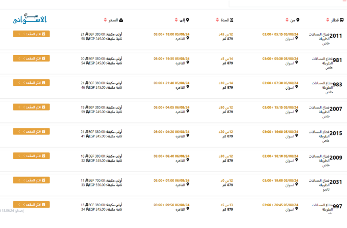 بالتوجه إلى الموقع الإلكتروني الرسمي لسكك حديد مصر، تبيّن عدم توافر أي قطارات خلال النصف الأول من شهر أغسطس، من أسوان إلى أي محافظة أخرى، كما تعذّر حجز تذاكر للنصف الثاني من أغسطس والأشهر التالية، بسبب عدم تفعيل خانة الأيام.