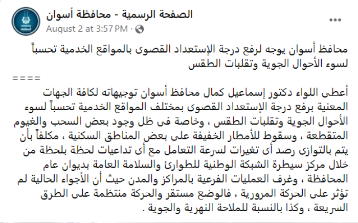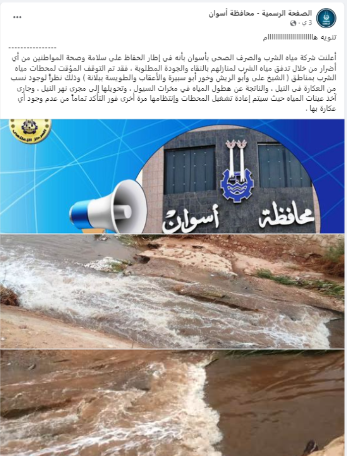 سبق وأن أعلنت شركة مياه الشرب بأسوان في 3 أغسطس الجاري، الانتهاء من أعمال الإحلال والتجديد بإحدى الخطوط المغذية لعدد من المناطق بمدينة أسوان، وضخ المياه التي ستصل لكافة المناطق المرتفعة والمنازل فى الأدوار العليا بعد امتلاء الشبكة، إلا أن مشكلة انقطاع المياه ما تزال تُمثّل عائقًا لعدد من المناطق في أسوان، خاصة مع تعرض المدينة لتقلبات جوية أعلنت فيها المحافظة تشغيل المرافق العامة بكامل طاقتها بعد تعرض مواقعها لمياه الأمطار وسوء الأحوال الجوية في 2 أغسطس.