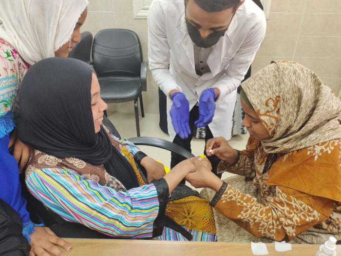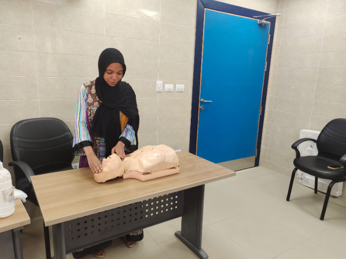 وأضافت أن الجانب الآخر من التدريب يركز على التعامل السليم مع مرضى السكري والضغط، لتقليل الأخطاء الشائعة في إعطاء الأدوية دون التأكد من نسب القياس، ويستهدف التدريب الفئة العمرية من 16 إلى 40 عامًا، ويشمل التدريب على الإنعاش القلبي الرئوي (CPR)، كيفية قياس الضغط والسكر، تركيب الكانيولا والمحاليل، أنواع الحقن، اختبار الحساسية، والتوعية بأهمية وجود حقيبة إسعافات في المنزل.