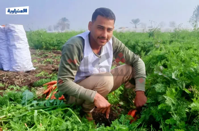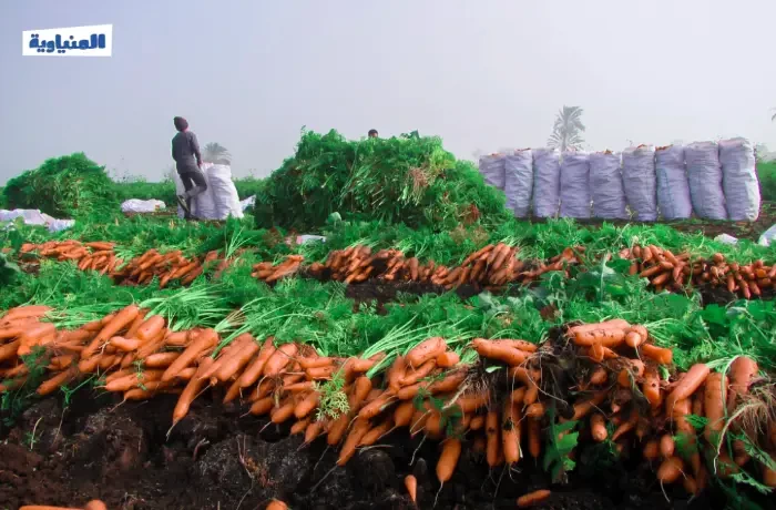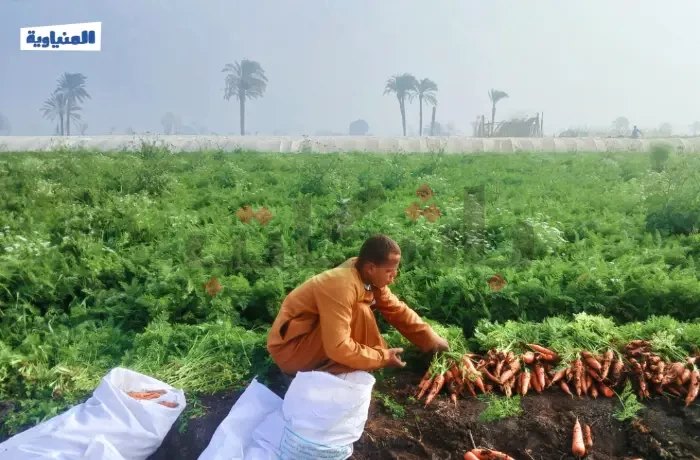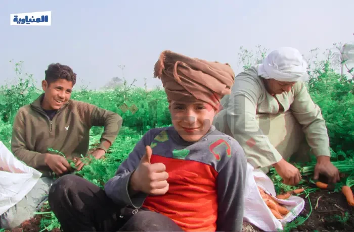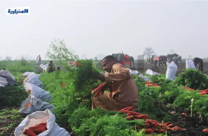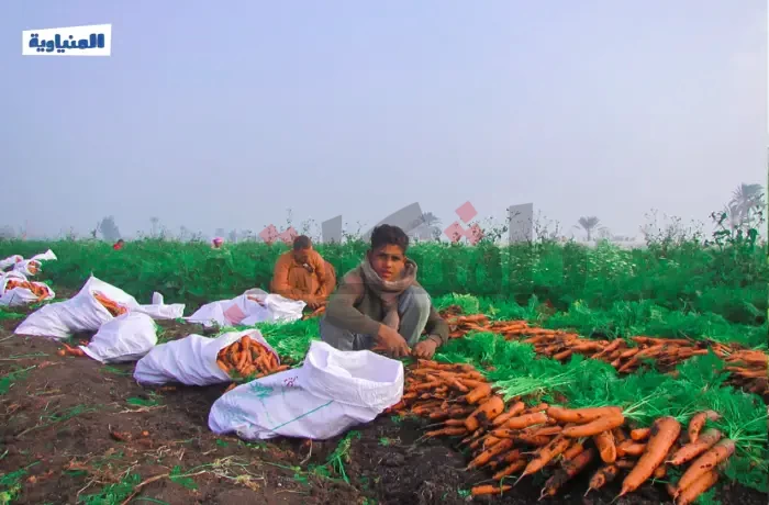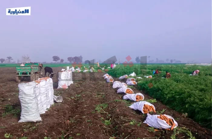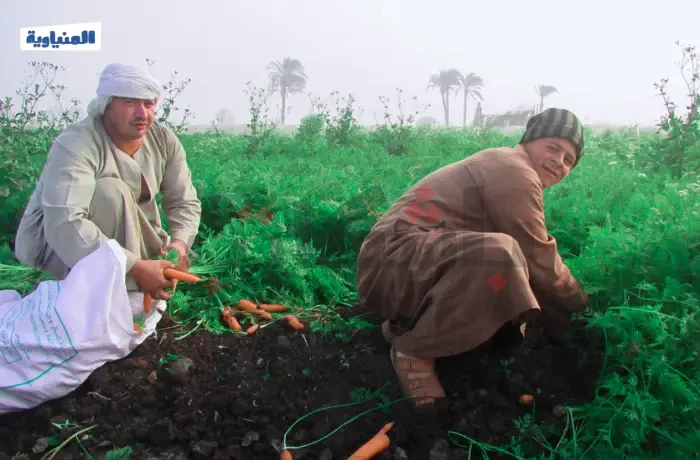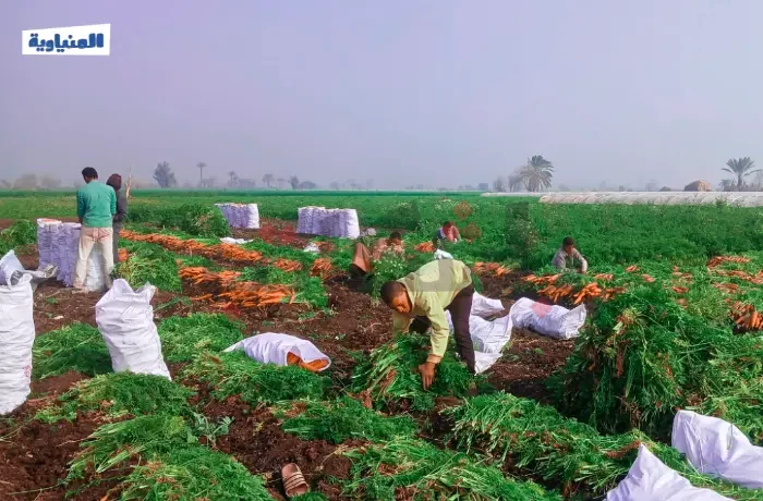 هنا قرية بني أحمد في محافظة المنيا، يوم حصاد الجزر الذي يبدأ في فبراير من كل عام، يصطف الجزر المقطوف في أكوام على الأرض، يتألق بلونه الزاهي، بينما الأجواء مليئة بحركة العمل الجماعي، حيث يتعاون الجميع في جمع المحصول الذي يمر بعدة مراحل من التنظيف والجمع تمهيدًا لنقله إلى الأسواق.
