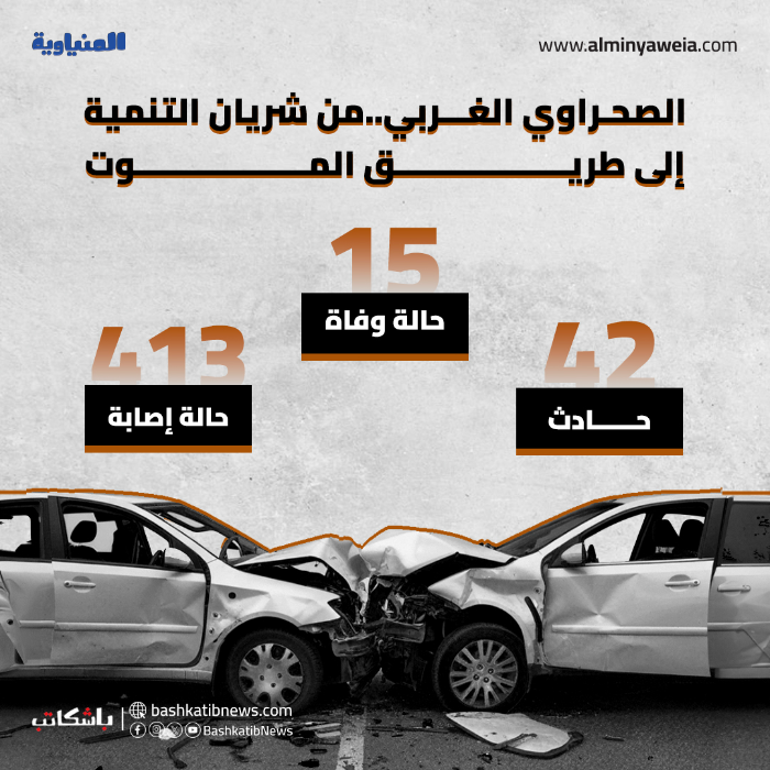 في 13 فبراير العام 2024، أصيب 8 أشخاص بكسور وكدمات متنوعة، إثر انقلاب سيارة بالطريق الصحراوي الغربي جنوب محافظة المنيا، وفي اليوم التالي لَقِيَ شخصان مصرعهما وأصيب 5 آخرين بكسور وجروح متفرقة، إثر وقوع حادث تصادم آخر بين سيارتين على نفس الطريق.