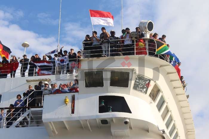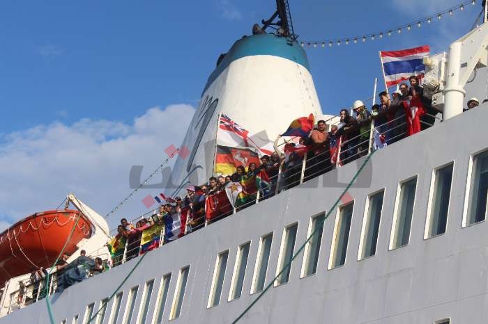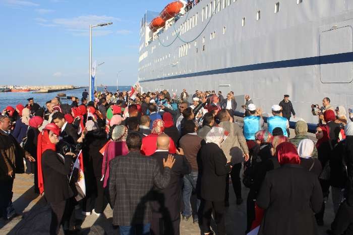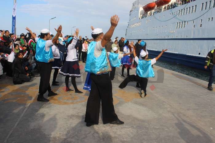 في اللحظة التي عانقت فيها السفينة ميناء بورسعيد، رفع روادها أعلام بلادهم، والبالونات الملونة لتحية الناس، ورد جمهور السفينة المنتظر وصولها التحية، بحمل لافتات تعبر عن فرحتهم بقدومها، وتقديم عرضًا خاصًا للرقص البمبوطي الشهير، الذي يعبر عن الثقافة البورسعيدية الأصيلة.