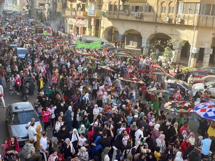 وشارك في الموكب المنتمون إلى الطرق الصوفية، وقيادات وزارة الأوقاف ومديرية الشباب والرياضة، وعدد من الجمعيات الأهلية، وفرق الفنون الشعبية، والعاملون بأحياء المحافظة، بالإضافة إلى عربات الأحياء المُزينة بالورود.
