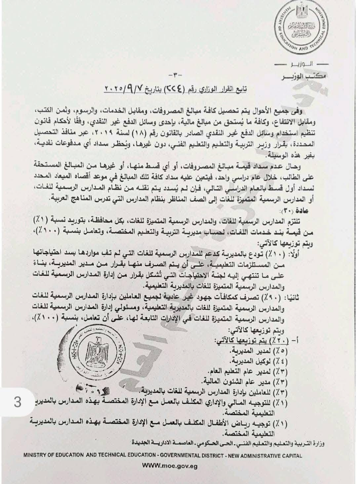 وجاء في نص القرار الوزاري رقم 224 لسنة 2025، الصادر في 7 سبتمبر 2025، أن وزارة التربية والتعليم قررت ضم رسوم الكتب المدرسية إلى المصروفات الدراسية في المدارس التجريبية للغات، ونص القرار كذلك على أن: "في جميع الأحوال يتم تحصيل كافة مبالغ المصروفات، ومقابل الخدمات وثمن الكتب ومقابل الانتفاع، وكافة ما يستحق من مبالغ مالية بجهات وسائل الدفع غير النقدي، وفقًا لأحكام قانون تنظيم استخدام وسائل الدفع غير النقدي، دون غيرها، ويحظر سداد أي مدفوعات نقدية بأي وسيلة".