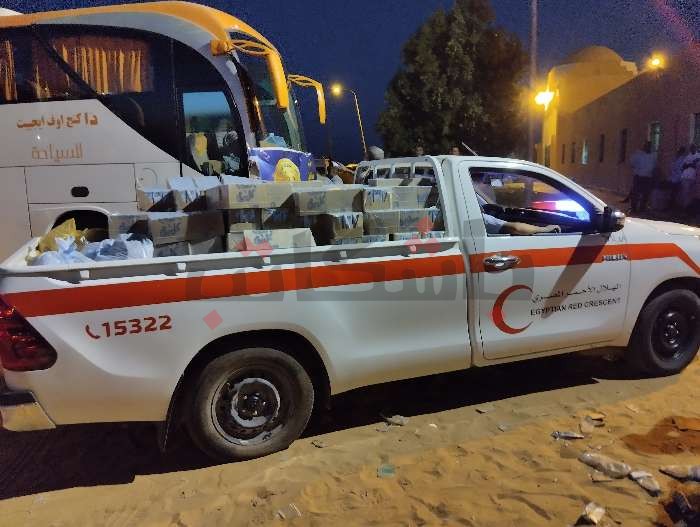 "In a bus filled with volunteers, we headed to the Arqeen crossing, one of the land border crossings between Egypt and Sudan, carrying a quantity of food aid such as:" "Juices and water" to be distributed to those crossing the border, whether Sudanese, who constitute the majority, or Egyptians returning from there, all of whom share in escaping the conflicts currently taking place in Sudan.