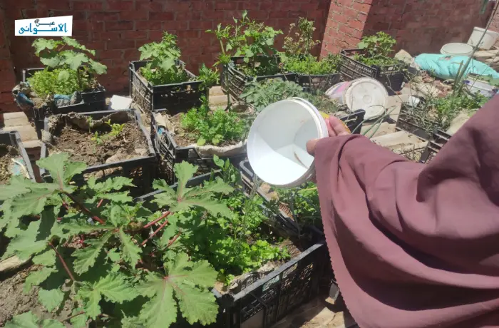 Marwa started planting garlic and onion in winter, and okra and molokhia in summer, becoming self-sufficient in these four crops for a long time, however, two years ago, she started planting other vegetables after the rise of prices, such as coriander, molokhia, and okra, she places her plants in plastic baskets on her rooftop, making sure no water leaks from them to the roof.
