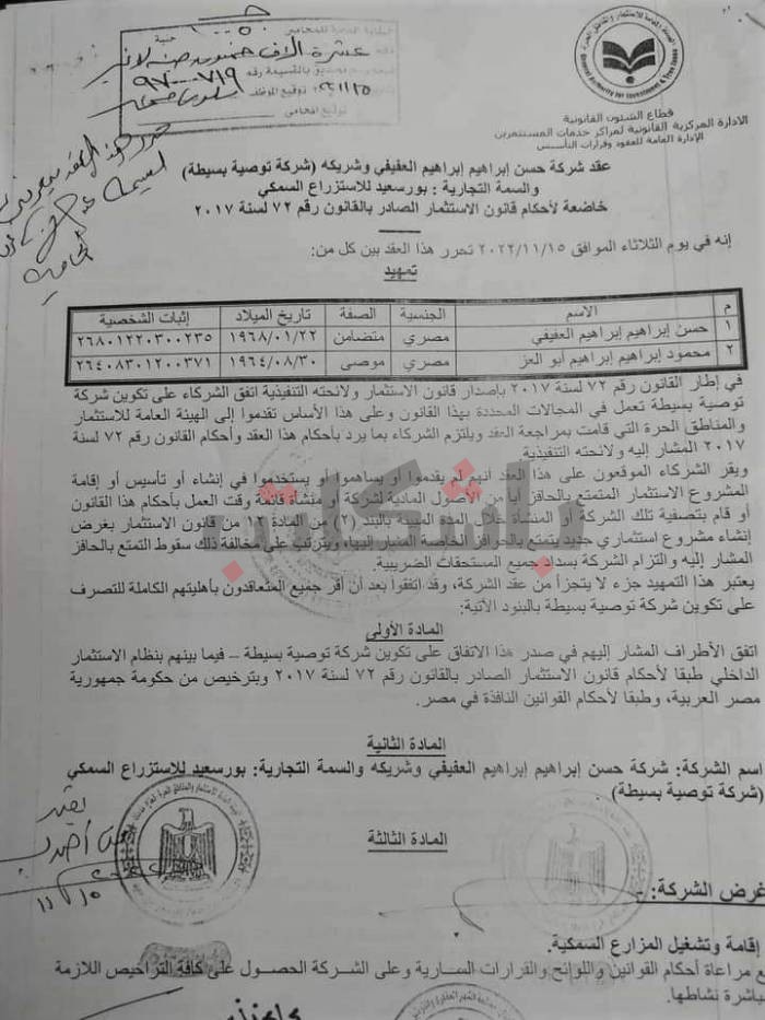 "El-Porsaddya” verified information about the leasing of Lake Manzala and obtained from a private source a contract under the name 'Hassan Ibrahim Ibrahim Al-Afifi and Partner,' with the trademark 'Port Said for Fish Farming.. ‘A Simple Recommendation Company.' This is to establish an investment project to operate and set up fish farms in Lake Manzala, with a license from the government of the Arab Republic of Egypt."