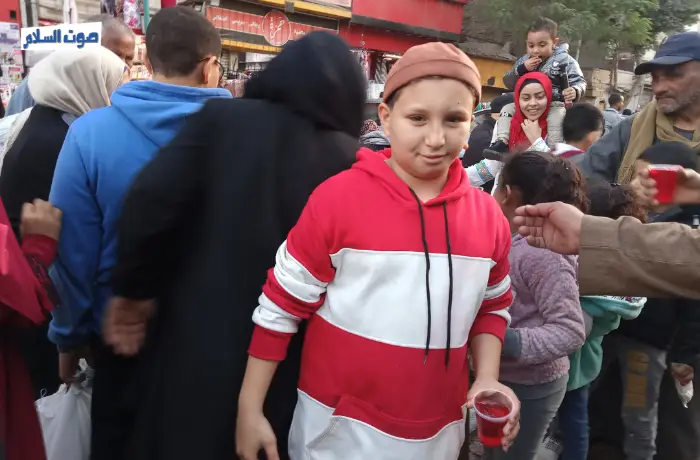 Praising voices are carried out all over Port Said Street, food stands are lined up next to each other, and nasheed singers gather in the circles designated for them, to celebrate the birth memory of Sayeda Zainab, during its closing night, on the other side some women distribute sherbet in celebration of the birth of the Lady.