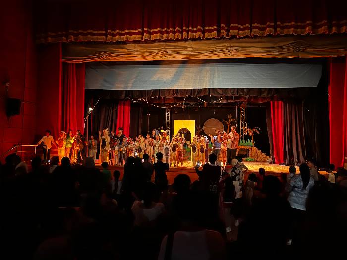 في البداية، تأخر بدء العرض عن موعده المحدد لمدة نصف ساعة، ثم بدأت المسرحية بعرض استعراضي قدمه أطفال، ولكن عند دخول الممثلين وبدء محادثاتهم، ظهرت مشكلة في الصوت، حيث لم يكن جميع الممثلين يرتدون "ميكروفونات" بالإضافة إلى أن الـ "الميكروفونات" المستخدمة في العرض لم تكن تنقل الصوت بكفاءة، وحاول بعض الممثلين الأداء بأصوات عالية، إلّا أن ذلك لم يحل المشكلة.