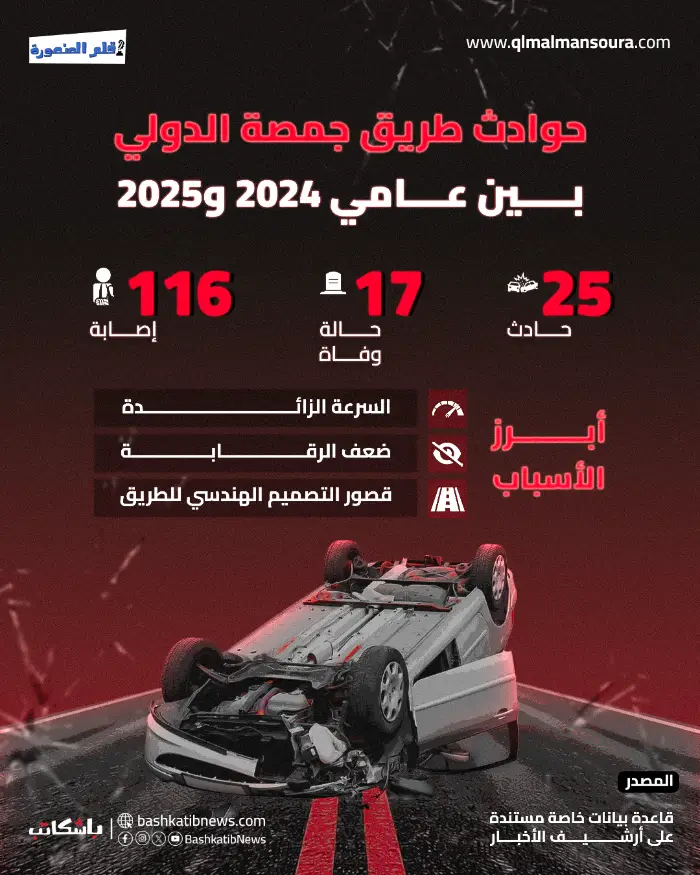 واستمر نزيف الحوادث حتى عام 2025. في فبراير الماضي وقع حادث تصادم أتوبيس يقل عمالًا تابعين لمصنع مواد غذائية وسيارة نقل، على طريق المنصورة الدولي، في محافظة الدقهلية، وأدى إلى إصابة 27 عاملًا.