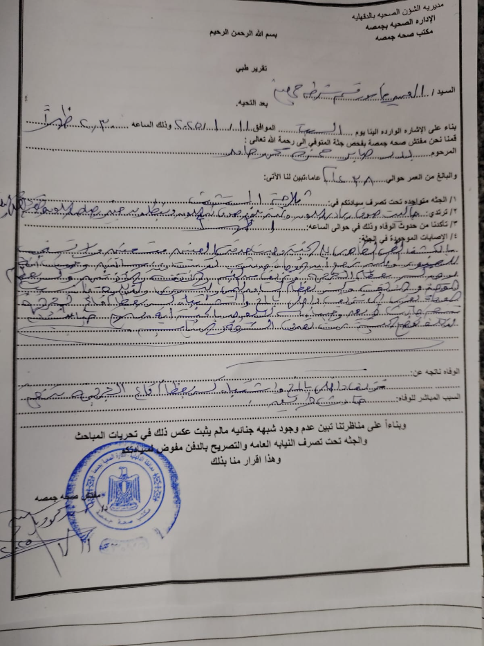 نقل صابر إلى مستشفى جمصة ولكن توفي في الحال، نتيجة كسور متفرقة في الجسم، ونزيف داخلي في المخ نتيجة الاصطدام، وفق تقرير مكتب صحة جمصة الذي حصل "قلم المنصورة" على نسخة منه.