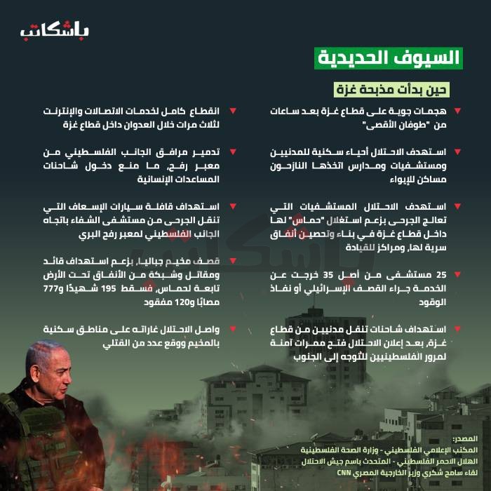 ويستمر جيش الاحتلال منذ الإعلان عن عملية "السيوف الحديدية" كرد على "طوفان" حماس في ارتكاب الجرائم التي تتعارض مع كل القوانين الدولية والانسانية مستهدفًا المدنيين والأحياء التي يسكنونها، ومراكز الايواء ومستشفيات ومراكز خدمات لسكان قطاع غزة؛ بحجة اختباء عناصر حماس بداخلها.