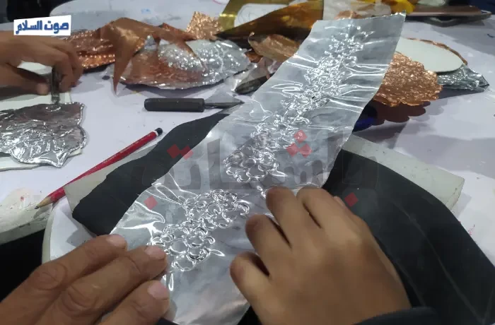 يشرح عزت عرفة، مدرب حرفة الطرق على النحاس بالجناح: "ليست مجرد حرفة ولكنها كانت مهنة مهددة بالانقراض، ورغم أن هذا هو أول عام لي في المعرض، إلا أنني أشعر بالسعادة بمجرد أن أرى طفلًا يصنع وردة على النحاس، ثم يذهب إلى والديه سعيدًا بما أنجزه، هذا المشهد يجعلني أستيقظ كل يوم وأنا متحمس، وأترك عملي كمدرب لأحمل معداتي وأذهب إلى المعرض".