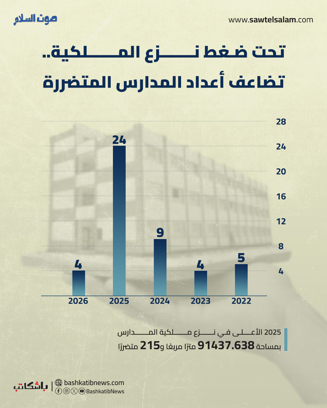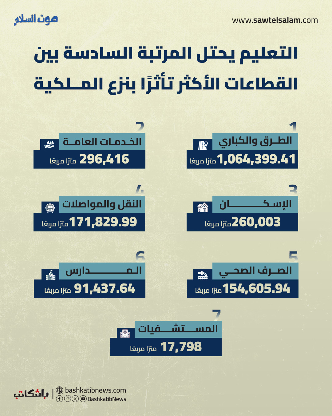 يتسق ذلك مع دراسة نُشرت في ديوان العمران بعنوان "باسم المنفعة العامة: 492 فدانًا من الملكيات الخاصة تحت قرارات الدولة"، والتي أوضحت أن عام 2025 سجّل أعلى عدد في قرارات نزع الملكية، حيث نُزعت ملكية 24 مدرسة بمساحة تقارب 91,437.638 مترًا مربعًا، ما أثر على حياة 215 شخصًا متضررًا.